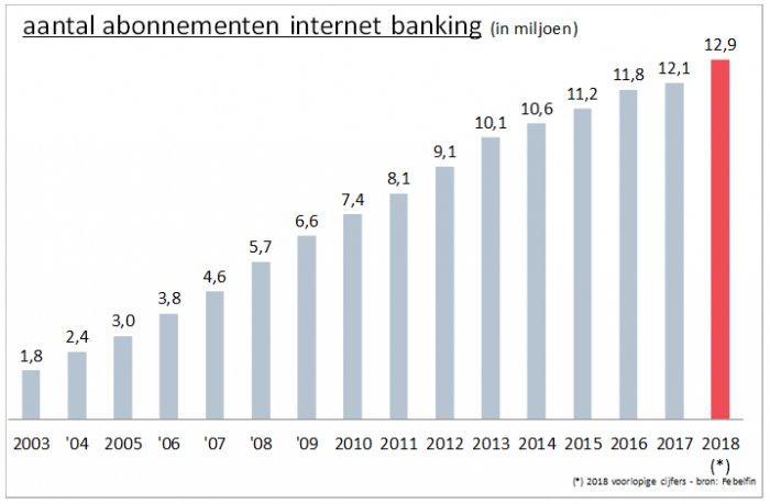 Internet banking continues to grow each year. At the end of last year, there were a total of 12.9 million subscriptions in circulation. If we go back fifteen years, internet banking was still quite limited. In 2003, there were only 1.8 million subscriptions.