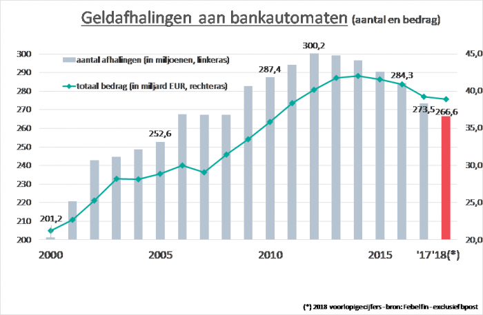 In contrast, there are cash payments and associated ATM withdrawals. In 2018, Belgians made an average of 23 cash withdrawals from their bank annually, with an average amount of 145.7 euros. Over the past few years, both the number of withdrawals and the withdrawn amount have been steadily declining.