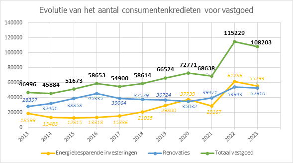 The consumer credit for renovations recorded a slight decline of 6% according to the record year 2022. The consumer credit for general renovations remained fairly stable in 2023 (decrease of -1.8% according to 2022), while credits for energy savings investments, such as the installation of a heat pump, solar panels or extra isolation fell sharply in 2023 (-9.8% according to 2022).