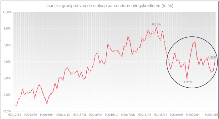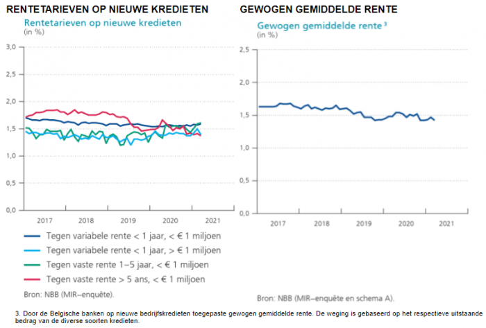 According to data from the NBB, the weighted average interest rate on new business loans in March 2021 was at a very low level, namely 1.42% (compared to 1.47% in February 2021). Since April 2019, the weighted average interest rate has been around 1.5%.
