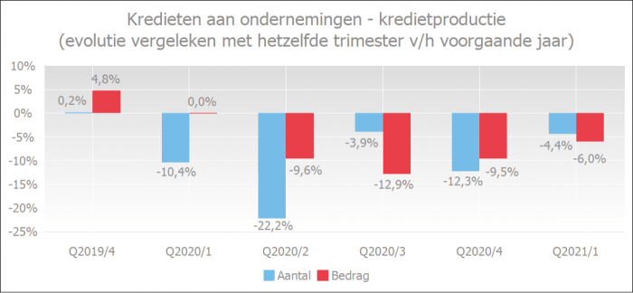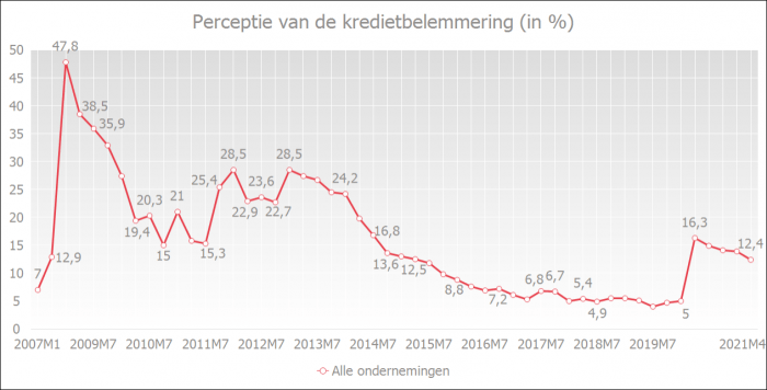 The quarterly survey by the National Bank of Belgium (NBB) shows that the perception of credit constraints by businesses has decreased in the past year. The percentage decreased from 16.3% in April 2020 to 12.4% in April 2021.
