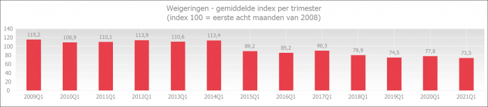 The rejection rate is at the lowest level ever compared to the rejection rate for all first quarters since the start of measurements. Given the challenging health and economic situation that undoubtedly has a negative impact on the quality of many loan applications, it is remarkable that the rejection rate is so low.