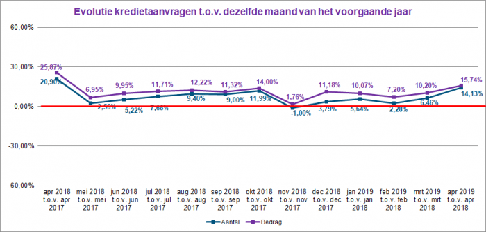 In April 2019, the number of mortgage credit applications increased by 14% compared to April 2018. In terms of amount, an increase of almost 16% was also observed compared to the previous year.