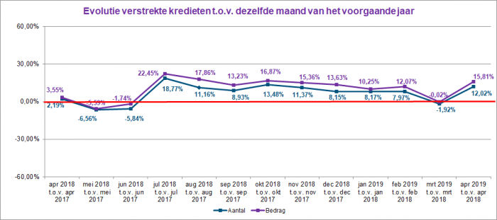 In April 2019, the number of credit applications increased by 14% compared to those recorded in April 2018. The total amount corresponding to these requests increased by almost 16%. In the same month, the number of granted loans increased by 12%. The amount of loans granted also increased by almost 16% compared to April 2018.