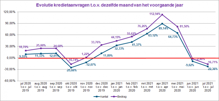 The number of loan applications decreased in July 2021 by approximately 22% compared to July 2020. The corresponding total amount of these applications was nearly 17% lower.
