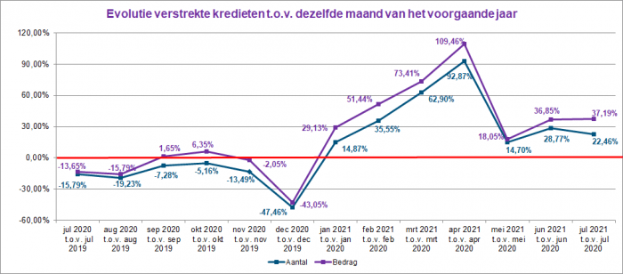 In July 2021, however, the number of granted credits increased by approximately 22.5%. In terms of amount, more than 37% more credit was granted than in July 2020.