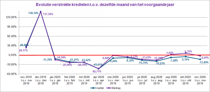 When determining the decrease in the number of granted loans compared to the same month of the previous year, it should also be noted that lending had increased exceptionally from October 2019 to the end of 2019 due to the abolition of the housing bonus in Flanders.
