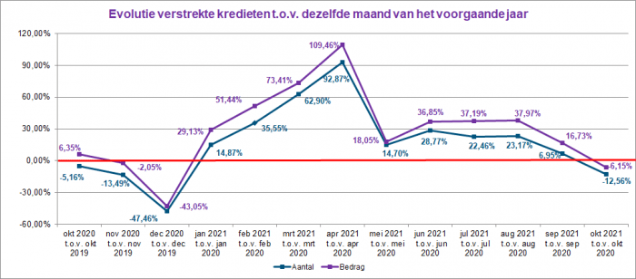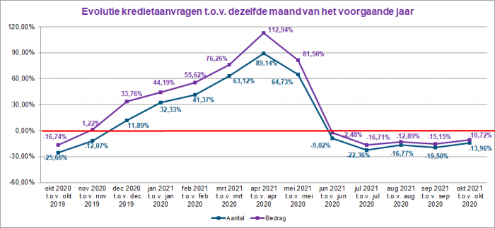 The number of loan applications decreased in October 2021 by approximately 14% compared to October 2020. The corresponding total amount of these applications was nearly 11% lower.