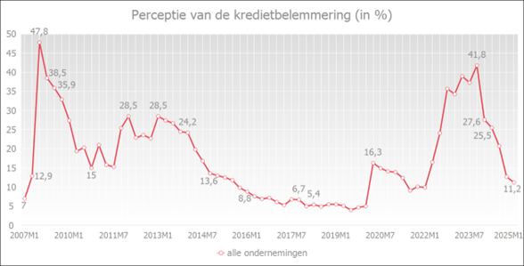 Results from the National Bank of Belgium's (NBB) quarterly survey on the perception of credit constraints among firms also indicate that banks would have eased their credit conditions slightly. The share of firms that perceived credit conditions as unfavourable stood at 11.2% in January 2025, down from 12.7% in October 2024.