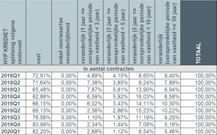 In the first quarter of 2020, almost 9 in 10 borrowers (87.5%) opted for a fixed interest rate or a variable interest rate with an initial interest rate fixation period of at least 10 years. About 10% of borrowers opted for a variable interest rate with an initial interest rate fixation period of between 3 and 10 years. The number of borrowers who opted for an annually variable interest rate was limited to approximately 2.7%.