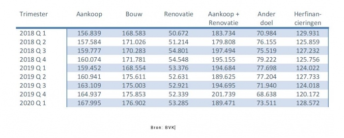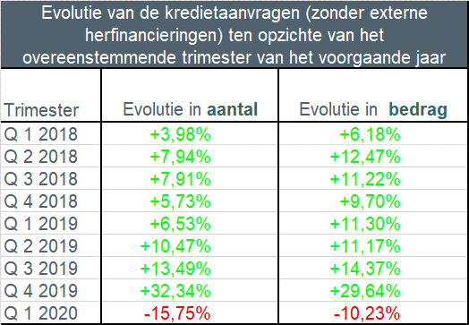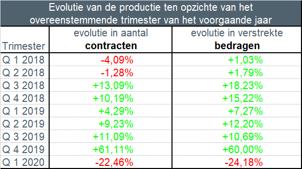 The abolition of the housing bonus in Flanders at the end of last year and the fact that many borrowers consequently completed their financing projects (purchase, construction and renovation) early at the end of 2019 in order to be able to benefit from the favorable housing bonus regime in Flanders with certainty at the time. have led to a sharp decline in lending in the first quarter of 2020.
