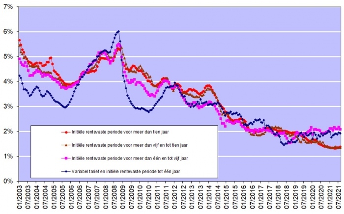 Taking into account the still very low interest rates (see chart below), the Belgian consumer continues to overwhelmingly choose security. The number of individuals opting for a variable interest rate remains low, especially in the case of an annually variable interest rate. However, even in the case of a variable interest rate, consumers are highly protected by legislation. For instance, after adjusting to changes in the applicable reference indices, the variable interest rate can never exceed twice the initial interest rate.