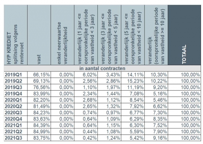 In the third quarter of 2021, once again, more than 9 out of 10 borrowers (92.9%) chose either a fixed interest rate or a variable interest rate with an initial fixed-rate period of at least 10 years. Just over 6.5% of borrowers opted for a variable interest rate with an initial fixed-rate period between 3 and 10 years. The number of borrowers opting for an annually variable interest rate is less than 0.5%.