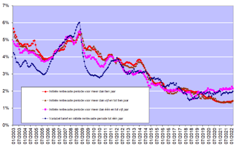 Taking into account the still very low interest rates (see graph below), Belgian consumers continue to overwhelmingly choose security. The number of individuals opting for a variable interest rate remains low, especially in the case of an annually variable interest rate. However, even in the case of a variable interest rate, consumers are highly protected by legislation. The variable interest rate, after adjustment to the evolution of the applicable reference indices, can never exceed double the initial interest rate.