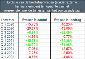 The number of credit applications, excluding those related to external refinancing, decreased by 8.5% in the first quarter of 2022 compared to the same quarter of the previous year. The underlying amount of credit applications also decreased by 4%.