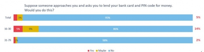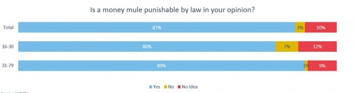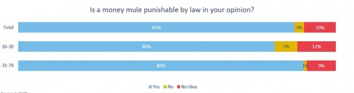 When asked whether becoming a money mule is illegal and therefore punishable, 10% of adults believe it is not. And as many as 19% of young people have no idea or think it is not punishable.
