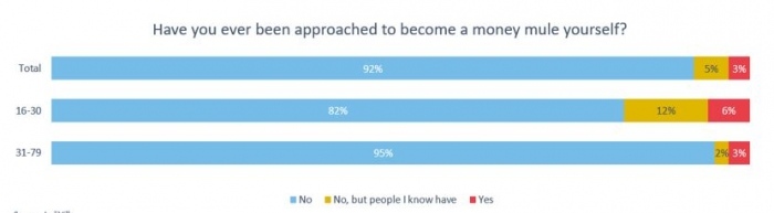 In the same study, 3% of the population indicated that they had ever been approached with the question of becoming a money mule. Among young people, this figure is much higher: 6% have been approached themselves and another 12% know someone who has been approached.