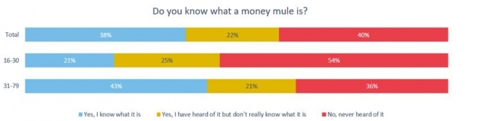 Worryingly, only 38% of the total population knows what a money mule is. An improvement on 2019 when the figure was 22%, but it still remains low. Striking: among young people, only 21% know what a money mule is. This means that 8 in 10 young people do not know what a money mule is.
