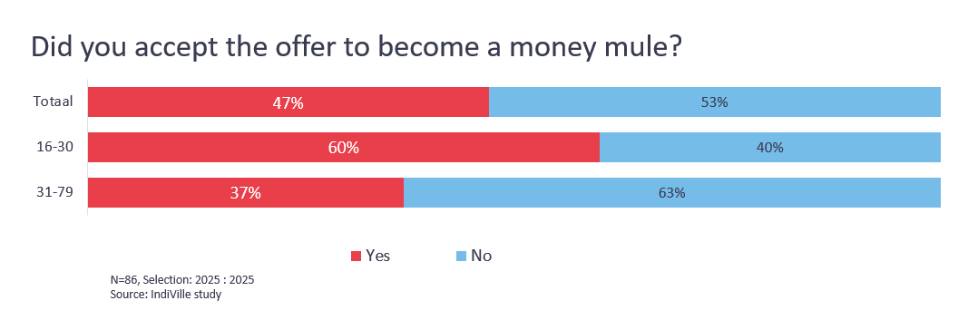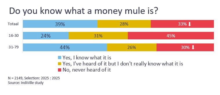 Knowledge about the phenomenon is still limited. Only 24% of young people know what a money mule is, while 45% have never even heard of it. Awareness is slightly higher among the general population, with 39% being familiar with the term.