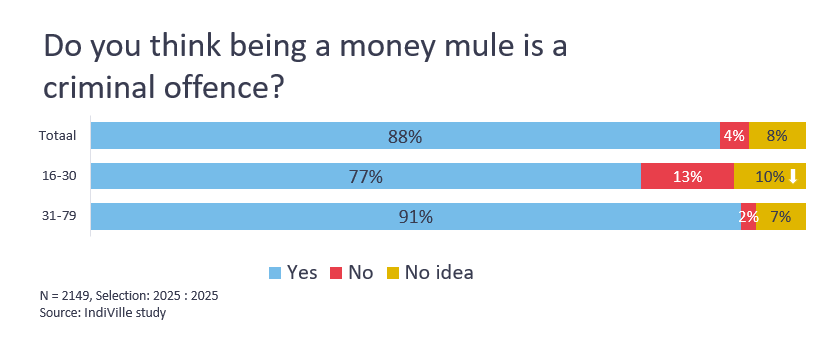 Young people are insufficiently aware of the criminal nature of this type of fraud. Although 77% of young people know that being a money mule is illegal, 13% still believe it is not. Among the general population, awareness is higher: 88% know it is a criminal offence.