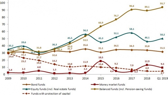 Within the group of funds primarily investing in non-fixed-income securities (such as equity funds), with the exception of capital protection funds, only rising trends were observed during the first quarter of 2019, primarily due to capital gains recorded from the underlying assets of these funds.