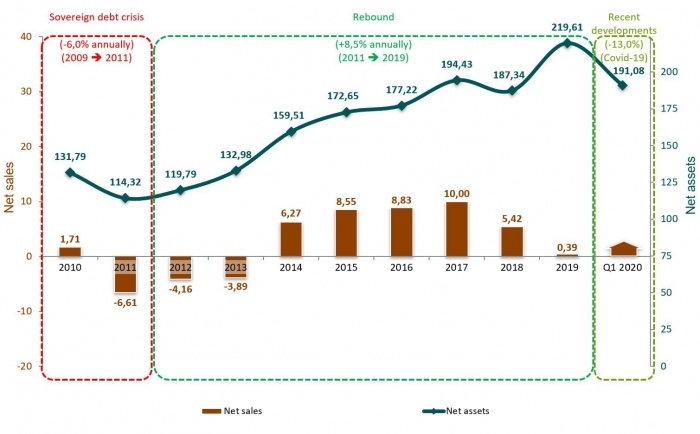 The Belgian fund sector experienced a decline of 13.0% during the first quarter of 2020 due to losses in the underlying assets caused by the impact of the Covid-19 pandemic on the global economy and financial markets. As of the end of March 2020, the net assets of publicly distributed funds in Belgium amounted to 191.1 billion EUR.