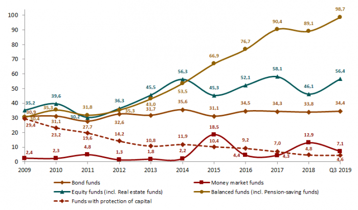 Within the category of mixed funds, pension savings funds continued to grow during the period from July to September 2019. With an increase of EUR 0.3 billion, they reached an all-time high of net assets totaling EUR 20.4 billion.