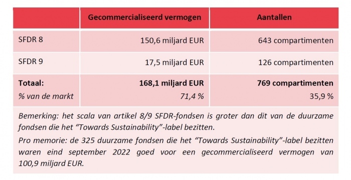 The table below provides an overview of the distribution of sustainable funds in Belgium as of the end of September 2022: