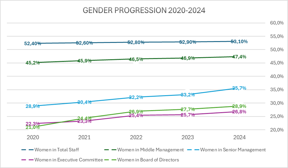 In 2024, women were more strongly represented at all levels of management. For the first time, they exceeded the 35.7% mark in senior management. Departures in this group of women executives have also decreased, a sign that the focus on retention and culture is paying off. In middle management, too, the proportion of women continued to increase to 47.4%, a positive development despite the slight increase in the number of voluntary departures in this group.