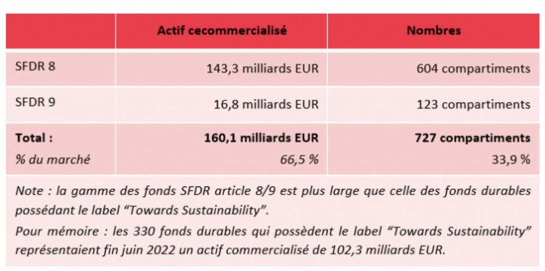 Le tableau ci-dessous donne un aperçu de la ventilation des fonds durables en Belgique, ce, à fin juin 2022 :