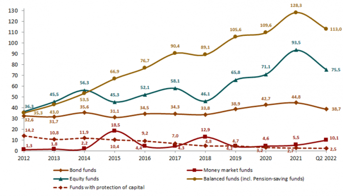 Bref, sous l’impulsion de baisses de cours enregistrées sur les actifs sous-jacents, l’actif net des fonds commercialisés publiquement en Belgique se situait à la mi-2022 12,6 %, soit 34,6 milliards EUR, en dessous du niveau de fin 2021.