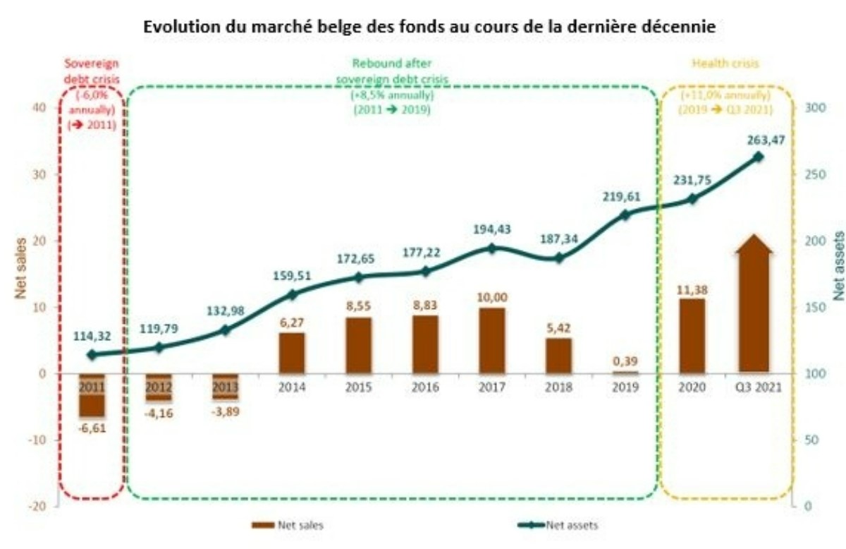 Au troisième trimestre de 2021, le secteur belge des fonds a enregistré une progression de +1,5 % et ce, totalement sous l’impulsion de souscriptions nettes. Fin septembre 2021, l’actif net des fonds commercialisés publiquement en Belgique atteignait 263,5 milliards EUR.
