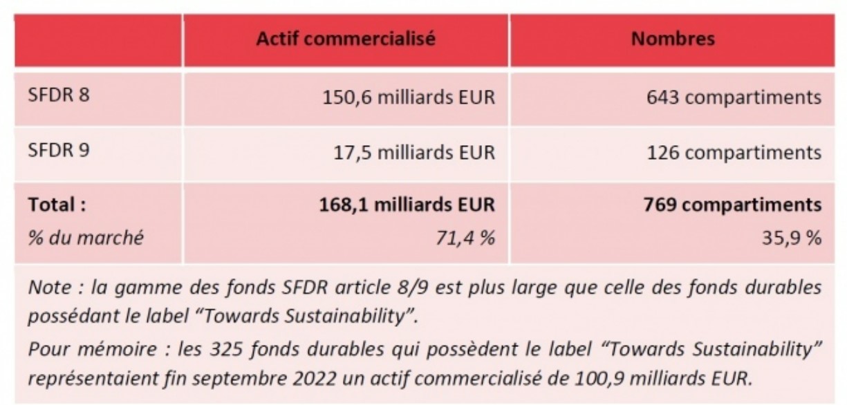 Le tableau ci-dessous donne un aperçu de la ventilation des fonds durables en Belgique, ce, à fin septembre 2022 :