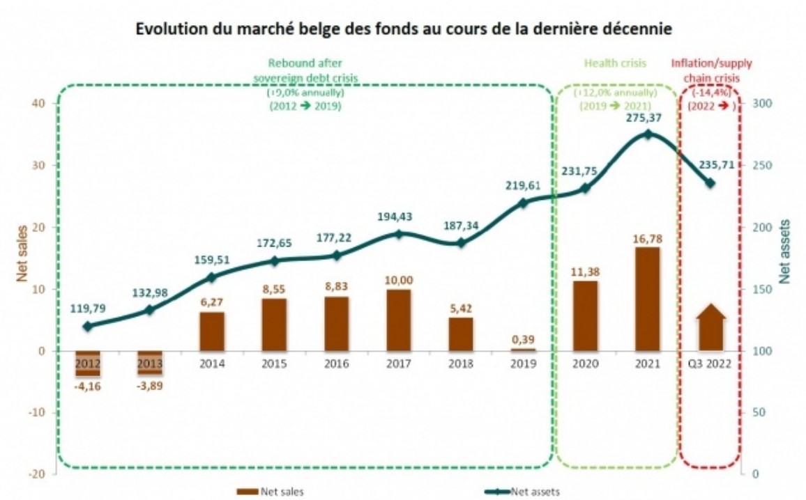 Au cours des neufs premiers mois de 2022, le secteur belge des fonds a enregistré une baisse de 39,7 milliards d'euros, soit -14,4 %. Cette diminution est intégralement due aux baisses de cours enregistrées sur les actifs sous-jacents, car il y a eu des souscriptions nettes de plus de 6,7 milliards EUR au cours de la période de janvier à septembre 2022. Ce fait est également confirmé par les données statistiques de la BNB.