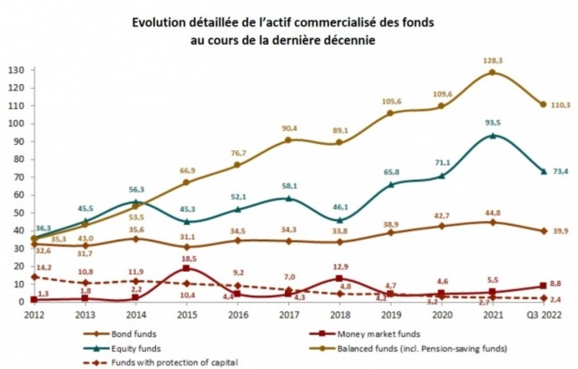 La catégorie des fonds mixtes (fonds d’épargne-pension inclus) a signé une contraction de 2,7 milliards EUR, soit -2,4 %, au cours du troisième trimestre de 2022. Cette diminution est imputable pour 90 % aux baisses de cours enregistrées sur les actifs sous-jacents et pour 10 % à des remboursements nets. L’actif commercialisé des fonds mixtes atteint ce faisant 110,3 milliards EUR à fin septembre 2022.