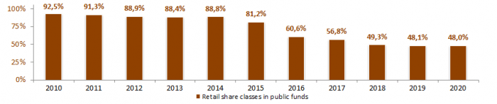 Pourcentage de classes d'actions retail sur le marché belge des fonds