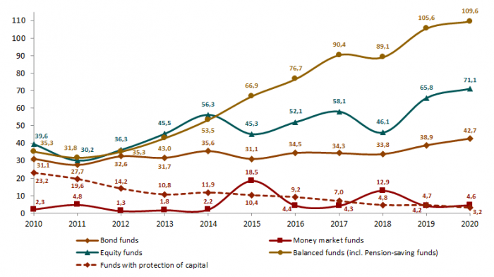 Dans ce cadre, la progression des fonds obligataires est caractéristique. Après 8 ans de quasi statu quo, les fonds obligataires ont progressé en 2019 et 2020, respectivement de 14,9 % et 9,8 %.