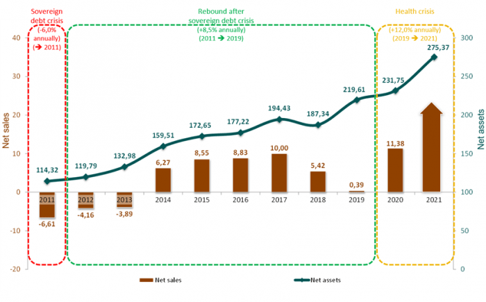 Dans ce cadre, la progression des fonds obligataires est caractéristique. Après 7 ans de légères fluctuations, les fonds obligataires ont progressé en 2019, 2020 et 2021, respectivement de 14,9 %, 9,8 % et 4,9 %.