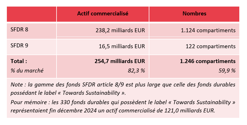 Le tableau ci-dessous donne un aperçu de la ventilation des fonds durables en Belgique, ce, à fin décembre 2024 :