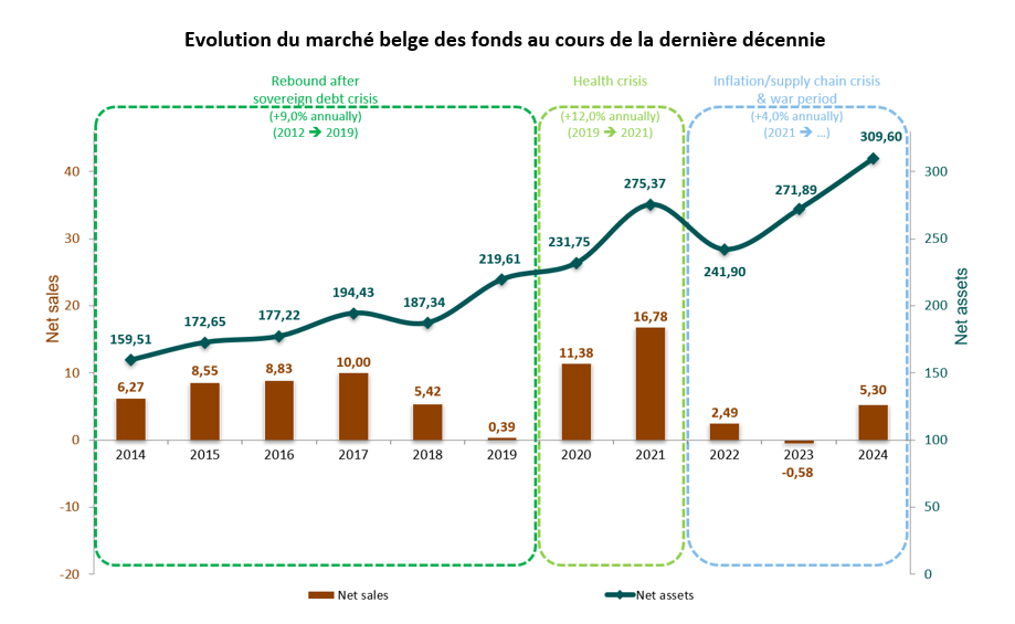 L'évolution du marché belge des fonds en 2024, qui se compose principalement de portefeuilles d'investissement diversifiés à l'échelle internationale, ne peut être dissociée du contexte économique mondial et des tensions géopolitiques.