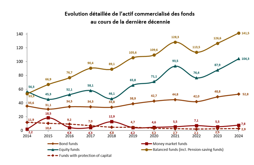 La catégorie des fonds mixtes (fonds d’épargne-pension inclus) a augmenté de 2,5 milliards EUR, soit +1,8 %, au cours du quatrième trimestre de 2024. Cette augmentation est imputable pour 70 % aux souscriptions nettes et pour 30 % aux hausses de cours enregistrées sur les actifs sous-jacents. L’actif commercialisé des fonds mixtes atteint ce faisant 141,5 milliards EUR à fin décembre 2024.