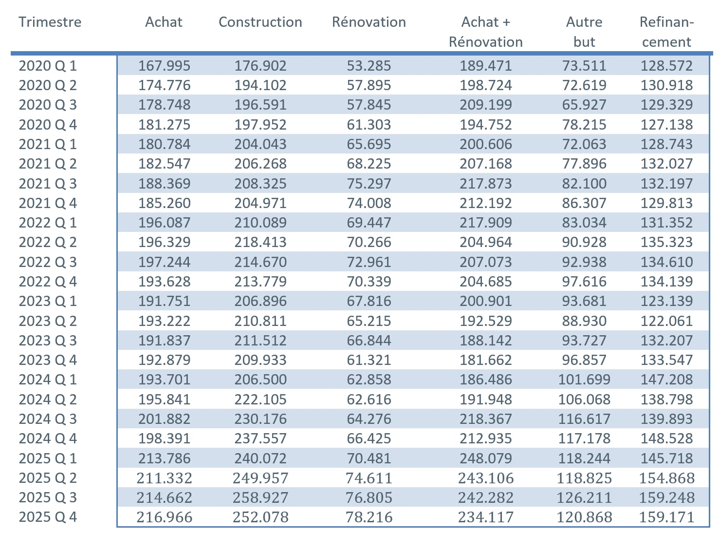 Toutes les statistiques en matière de crédit hypothécaire (2000 – 2025), ventilées selon la destination du crédit et le type de taux d’intérêt, sont disponibles ici :
