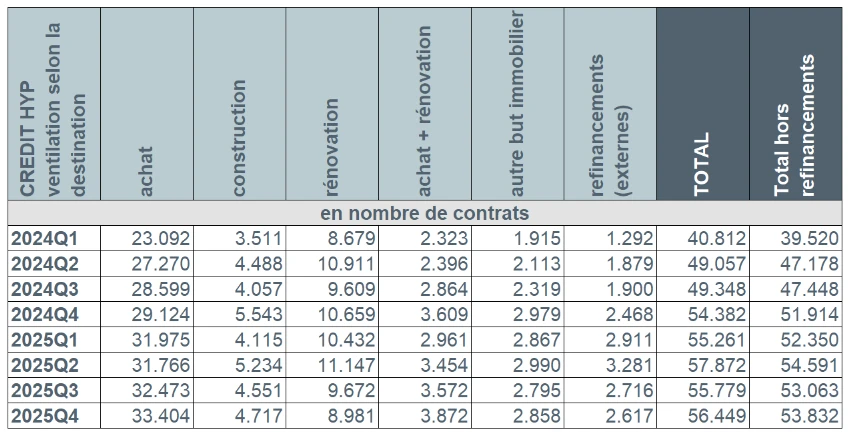 Le nombre de demandes de crédit pour l’achat d’un logement (-1.235) a diminué de 2,6%, celui pour la rénovation d’un logement (-2.031) de -15,4%, celui pour la construction d’un logement (-543) de -7,5% et celui des demandes de crédit pour d’autres destinations5 (-761) de -15,1%. Le nombre de demandes de refinancements externes (-726) a enregistré une baisse de 16,6% au cours du dernier trimestre 2025. Seule exception : le nombre de demandes de crédit pour l’achat + rénovation (+271 soit +5,4%).