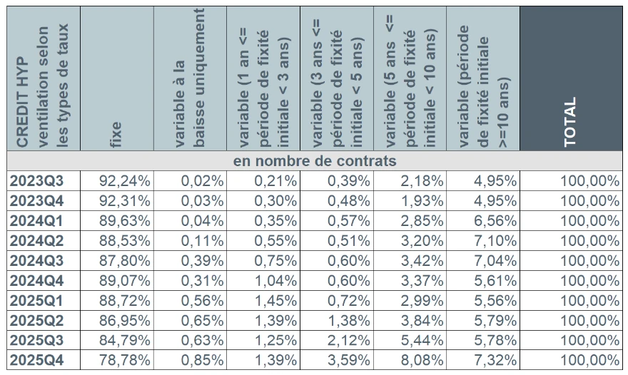 Au cours du quatrième trimestre 2025, plus de 8 emprunteurs sur 10 (86,1%) ont opté pour un taux d’intérêt fixe ou un taux d’intérêt variable assorti d’une période initiale de fixité des taux de minimum 10 ans. Environ 11,7% des emprunteurs ont privilégié un taux d’intérêt variable assorti d’une période initiale de fixité des taux entre 3 et 10 ans. Le nombre d’emprunteurs ayant choisi un taux variable annuellement s’est limité à 2,2%.