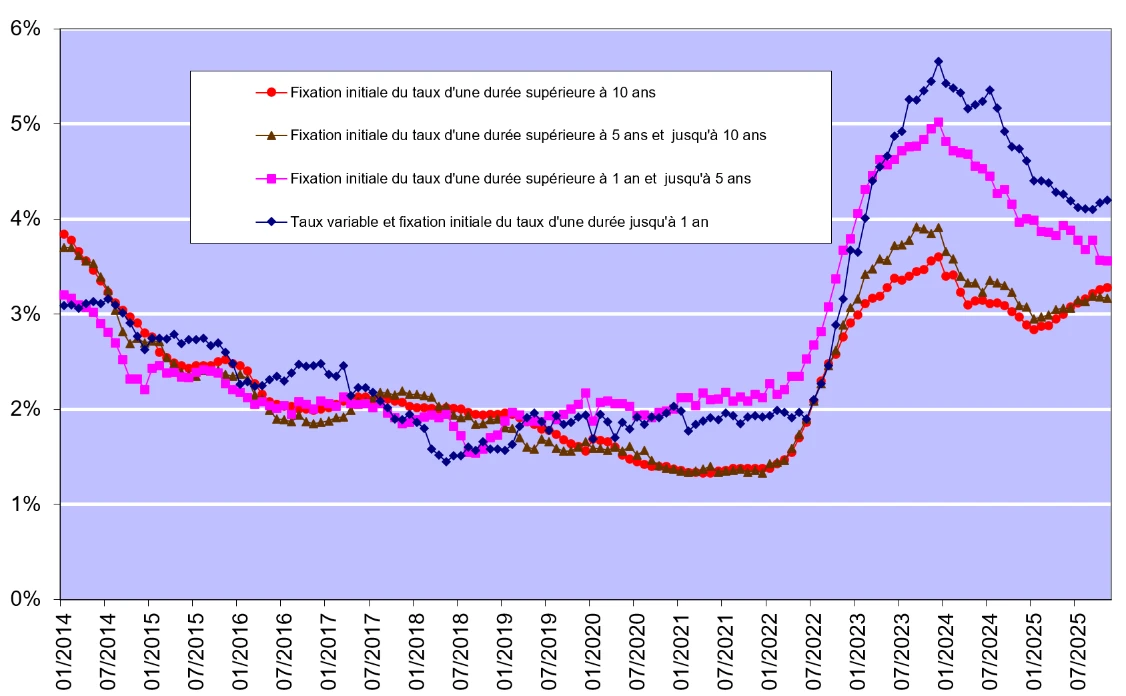 Les taux d’intérêt continuent de jouer un rôle majeur dans l’évolution de la production. Sur la base des chiffres publiés par la Banque Nationale de Belgique, ces taux oscillaient en novembre 2025 entre 3,28% (pour les crédits à taux variable assortis d’une période initiale de fixité du taux de plus de 10 ans) et 4,20% (pour les crédits assortis d’une période initiale de fixité du taux jusque 1 an).