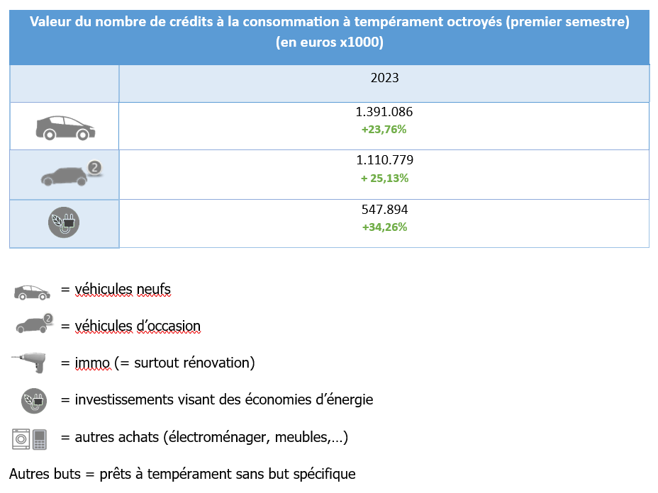 les statistiques relatives au crédit à la consommation publiées ce jour par l'Union professionnelle du crédit (UPC) indiquent que le nombre total de crédits à la consommation octroyés au premier semestre 2023 a augmenté de 9,7% par rapport à la même période de l'année dernière, la valeur totale des crédits octroyés a, quant à elle, progressé de 10,2% pour atteindre un peu plus de 5 milliards d’euros. En particulier, la demande de crédits à visées écoénergétiques continue de croître, la valeur de ces crédits augmentant de +34%, pour atteindre plus d'un demi-milliard d'euros. Pour souligner l'importance du crédit à la consommation dans la transition écologique, l’UPC lance une campagne d'information.