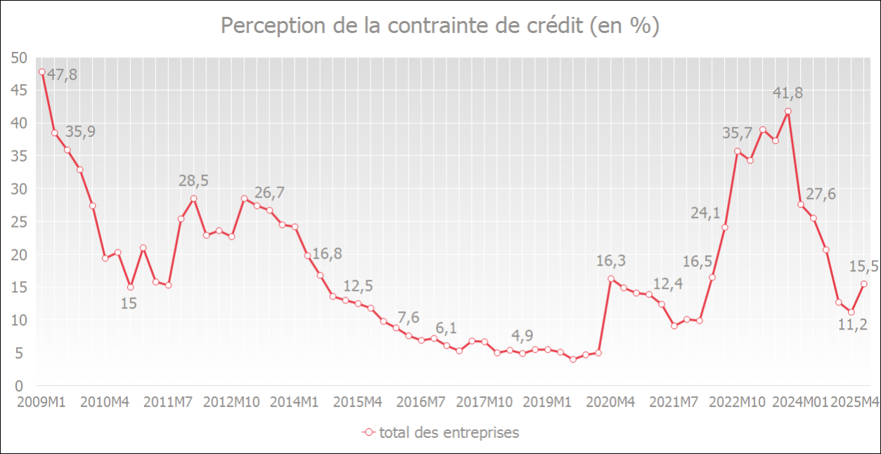 Le graphique ci-dessous montre l'évolution de la perception des contraintes de crédit. Une diminution traduit la perception d'un assouplissement des conditions de crédit. Une augmentation, quant à elle, indique que les entreprises pensent qu'il est moins facile d’obtenir un crédit.