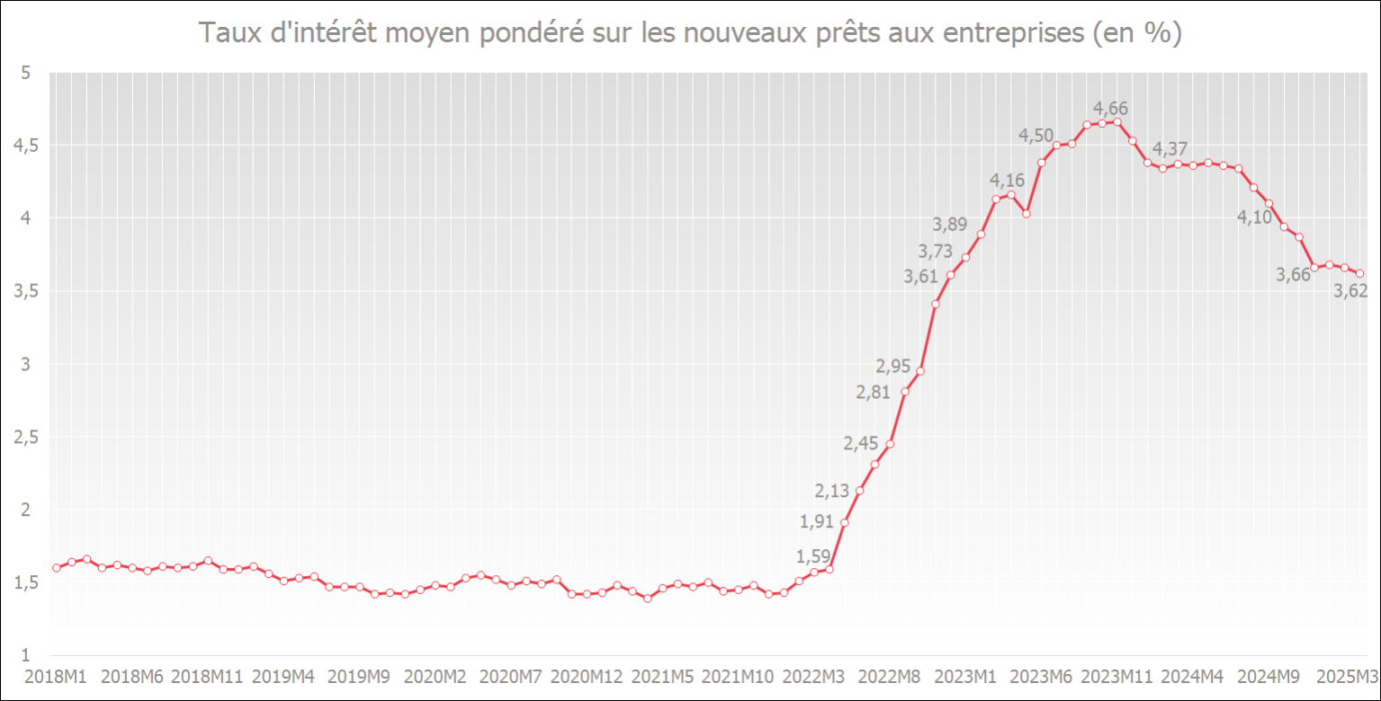 Le taux d'intérêt moyen pondéré sur les nouveaux crédits aux entreprises a atteint un pic de 4,66% en novembre 2023. En mars 2025, ce taux d’intérêt était déjà redescendu à 3,62%.