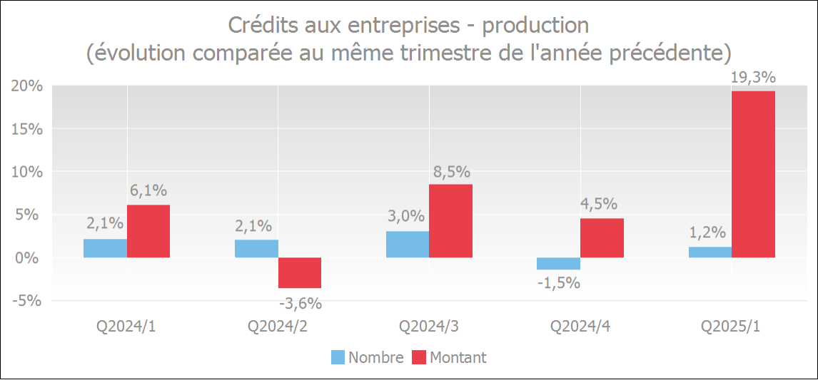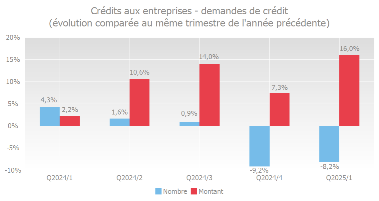 Au premier trimestre de 2025, les demandes de crédits des entreprises ont diminué de 8,2% par rapport à la même période de 2024. Le nombre de crédits accordés n'a augmenté que de 1,2 %. Les crédits octroyés aux entreprises se sont donc stabilisés au premier trimestre de 2025.