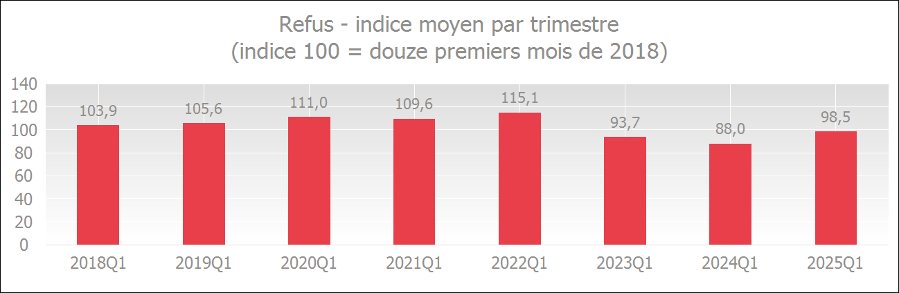 Bien que le taux de refus au premier trimestre de 2025 dépasse légèrement celui des premiers trimestres de 2023 et 2024, il reste à un niveau peu élevé.
